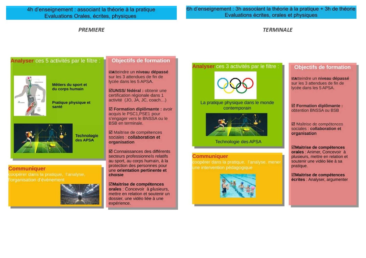 - 5 APSA différentes (Natation / Sauvetage / Cross training / Gymnastique au sol / Badminton). L’objectif est d’atteindre un niveau de pratique approfondi, en vue de favoriser l’accès à certaines formations diplômantes (surveillant de baignade/ BNSSA) et à l’animation de celles-ci auprès différents publics.
